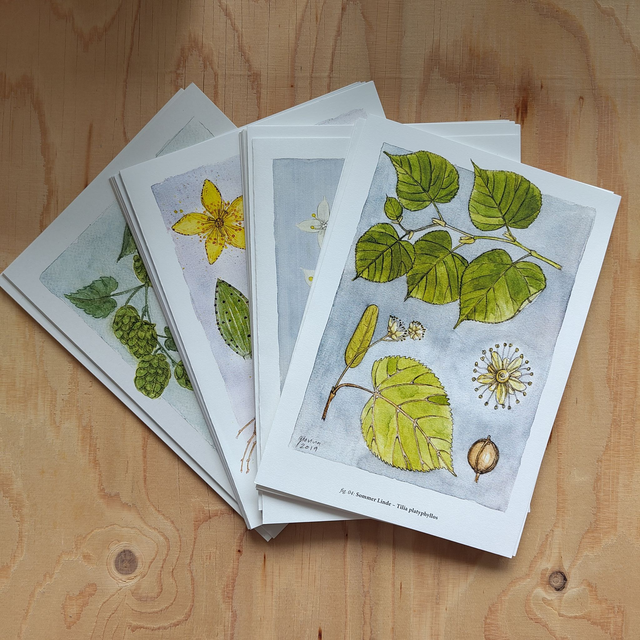 23 Pflanzenportraits, jeweils als A5 Doppelseite, inkl. Aquarell Illustration.